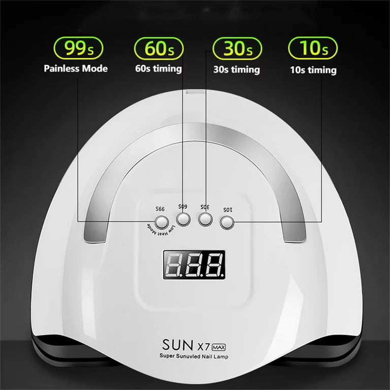 180 watt dual light source nail dryer, with 57 lamp beads, can dry all kinds of gel nail polish in just 10 seconds, including top coat, primer, color lacquer, hard gel , decoupage glue, gemstone glue, acrylic, etc. The nail dryer lamp is a professional nail dryer with a long service life. It can meet almost all manicure needs for nails and toenails.