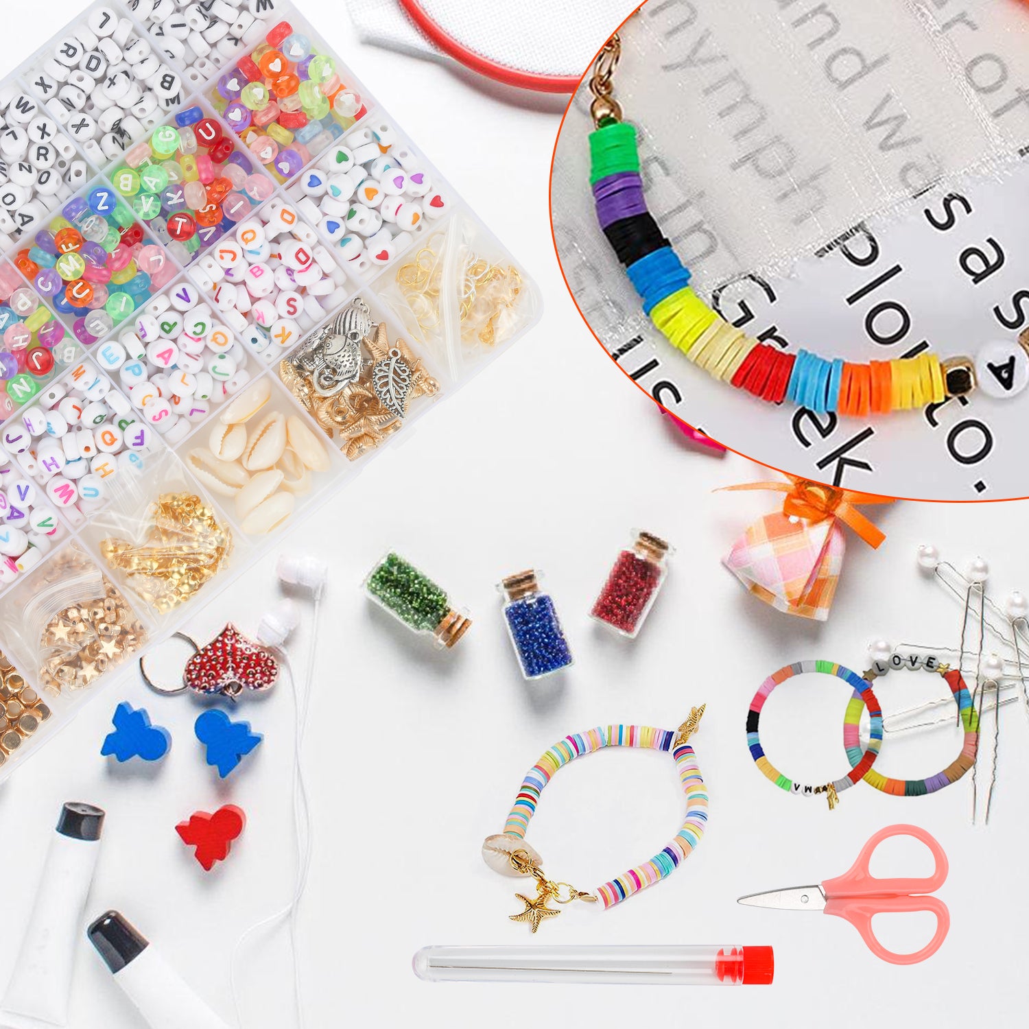 - Complete Jewelry Diy Kit - Our bracelet making kit has 4800 round clay beads, 900 letters and pendants, 40 lobster clasps, 50 binders, 2 rolls of 10m elastic cords, and 50 gold open loops, etc.